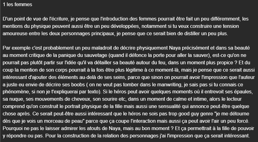 Dix ans plus tard, j’ai toujours la même réaction quand je tombe sur un passage man mal écrit. Mais depuis ce mail, j’ai précisé et affûté les pistes d'amélioration que je propose aux auteurs et autrices (problème sociétal, on a dit !) pour déjouer le piège du male gaze :